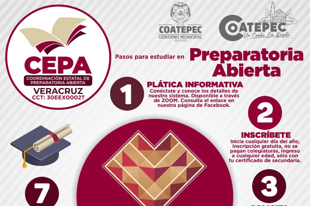 La Secretaría de Educación del Estado de Veracruz, a través de la Dirección de Preparatoria Abierta, en colaboración con el H. Ayuntamiento de Coatepec, hizo extensiva una invitación a los interesados a inscribirse en este sistema educativo flexible, pues la modalidad permite a quienes desean continuar con su educación, hacerlo de manera autónoma y a su propio ritmo, adaptándose a sus horarios y responsabilidades personales.