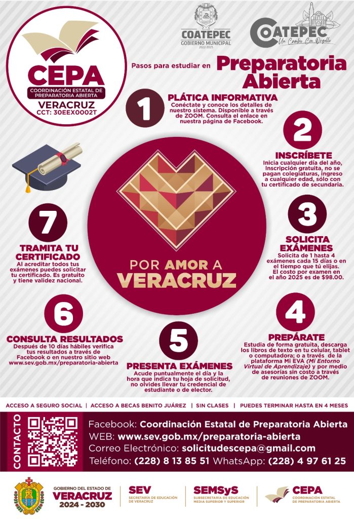 Para obtener más información, los interesados pueden acudir a la Subdirección de Educación, ubicada en la planta baja del Palacio Municipal de Coatepec y también pueden comunicarse a los números telefónicos 2288138551 o 2284976125, disponibles vía WhatsApp. Además, pueden consultar la página de Facebook de la Coordinación Estatal de Preparatoria Abierta, el sitio web oficial www.sev.gob.mx/preparatoria-abierta o enviar un correo a solicitudescepa@gmail.com.